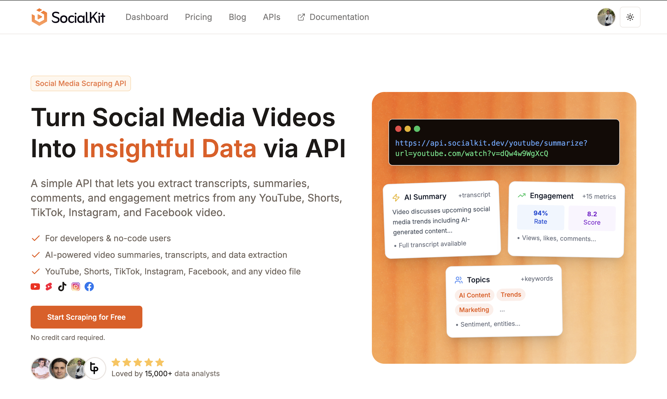 | SocialKit | Third-party video extraction | $1.66 to $4.75 per 1k | 20 credits | YouTube, TikTok, Instagram, Facebook, raw video |