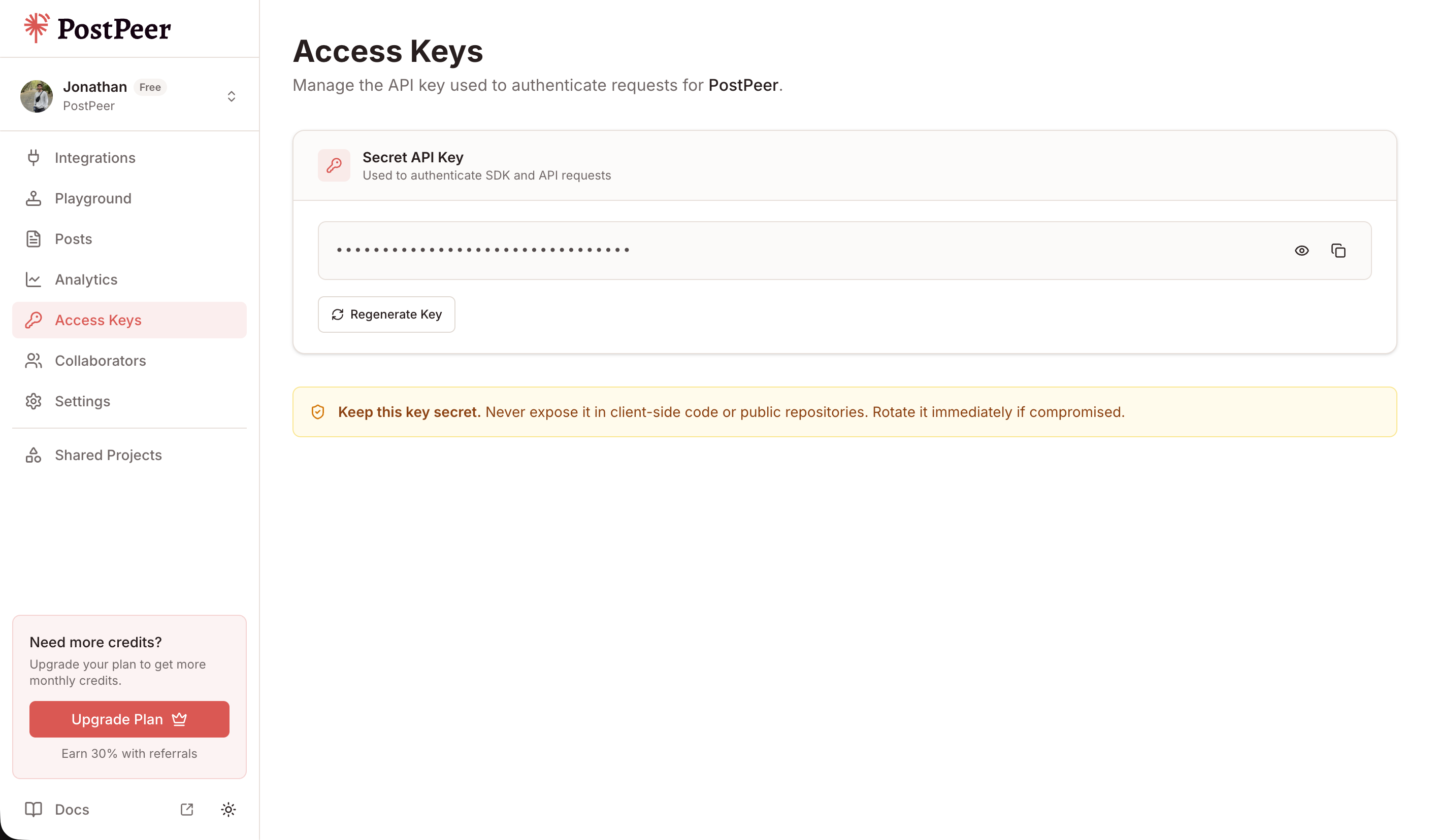 Grab your API key from the Access Keys page in your dashboard. Keep it secret — treat it like a password.
