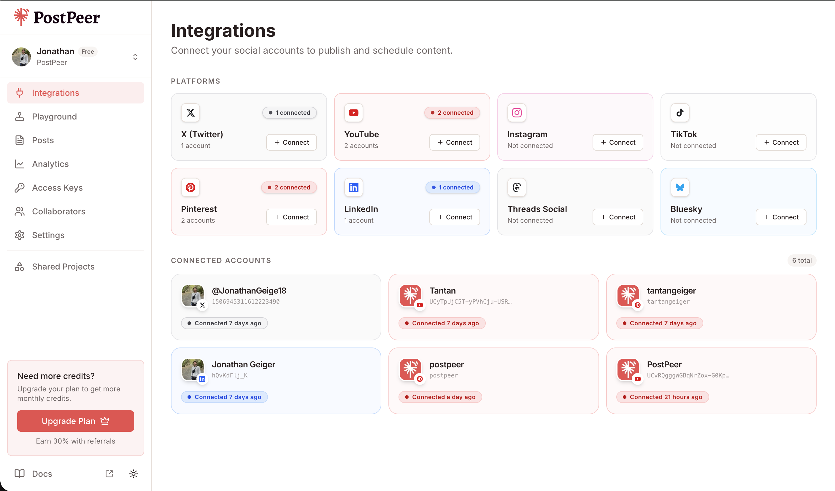 You can connect accounts either through the API (GET /v1/connect/{platform}) or directly in the PostPeer dashboard. The dashboard gives you a visual overview of all your connected accounts.