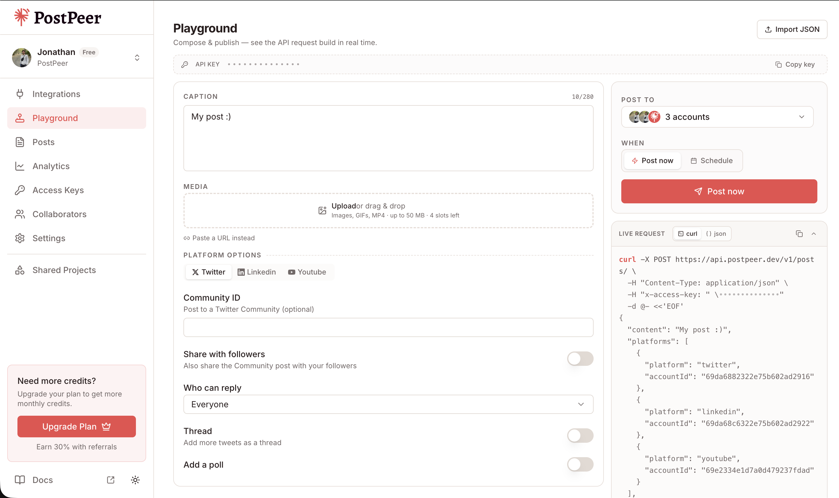 If you prefer a visual interface, the Playground lets you compose posts, select multiple accounts, attach media, and see the exact API request being built in real time.