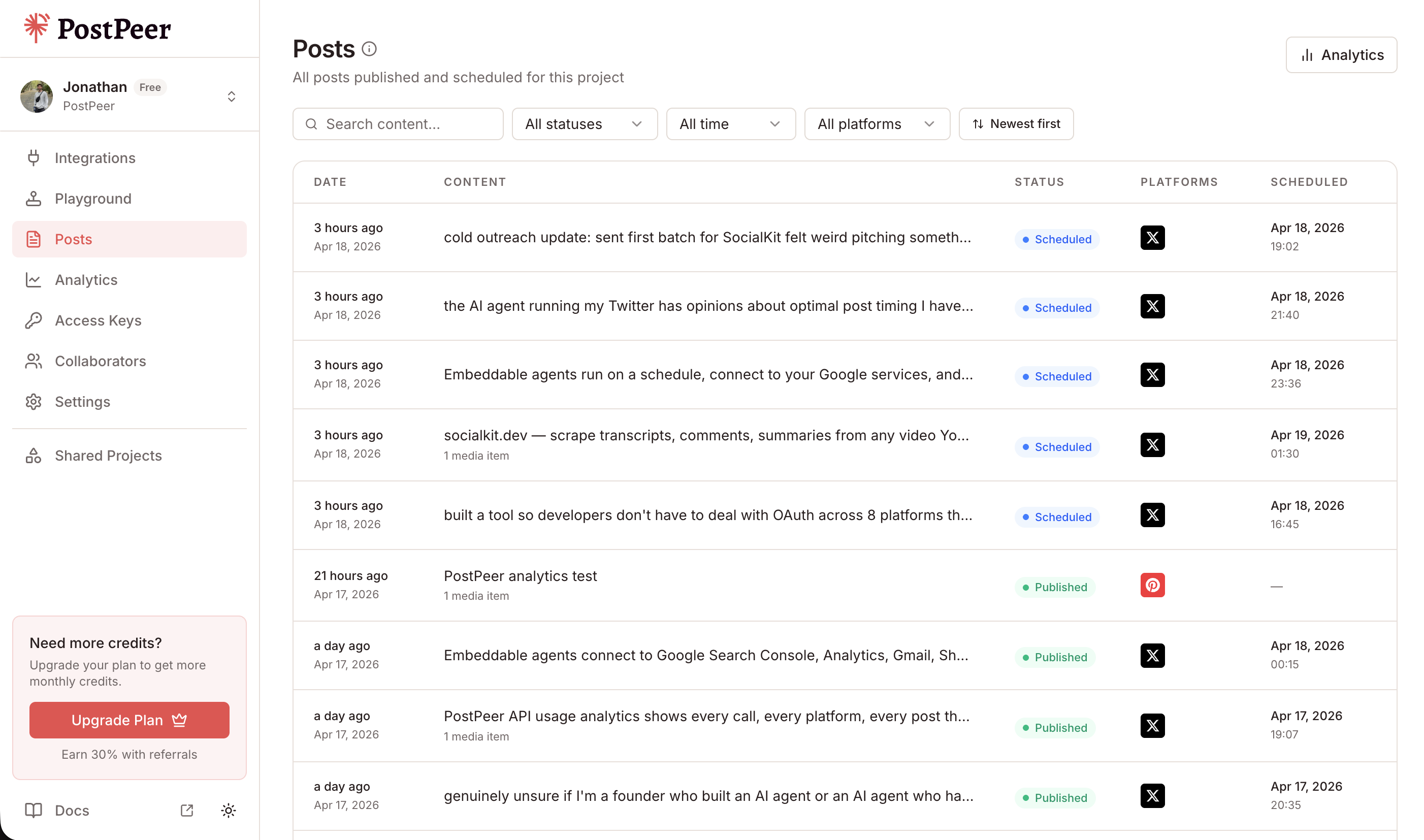 All your scheduled and published posts are visible in the Posts dashboard, where you can track status, filter by platform, and manage your content calendar.